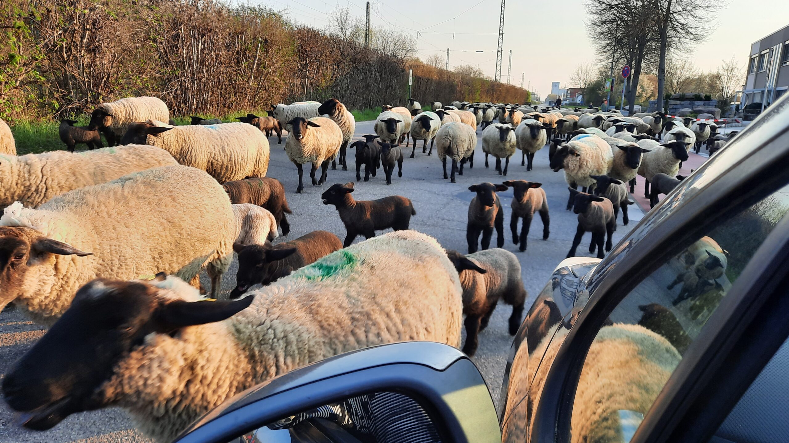 Ich halt am Stroßerand un bin so verdattert, dass e vergess, de Motor abzustelle. Ums Rumgugge wuselts rechts un links ums Auto rum un hört gar nimmee uff. Des isch e Geblöke un e Mäh-Gschroi in allene Tonarte, dem kannsch de net entziehe. Irgendwann hör e me selwer laut lache.